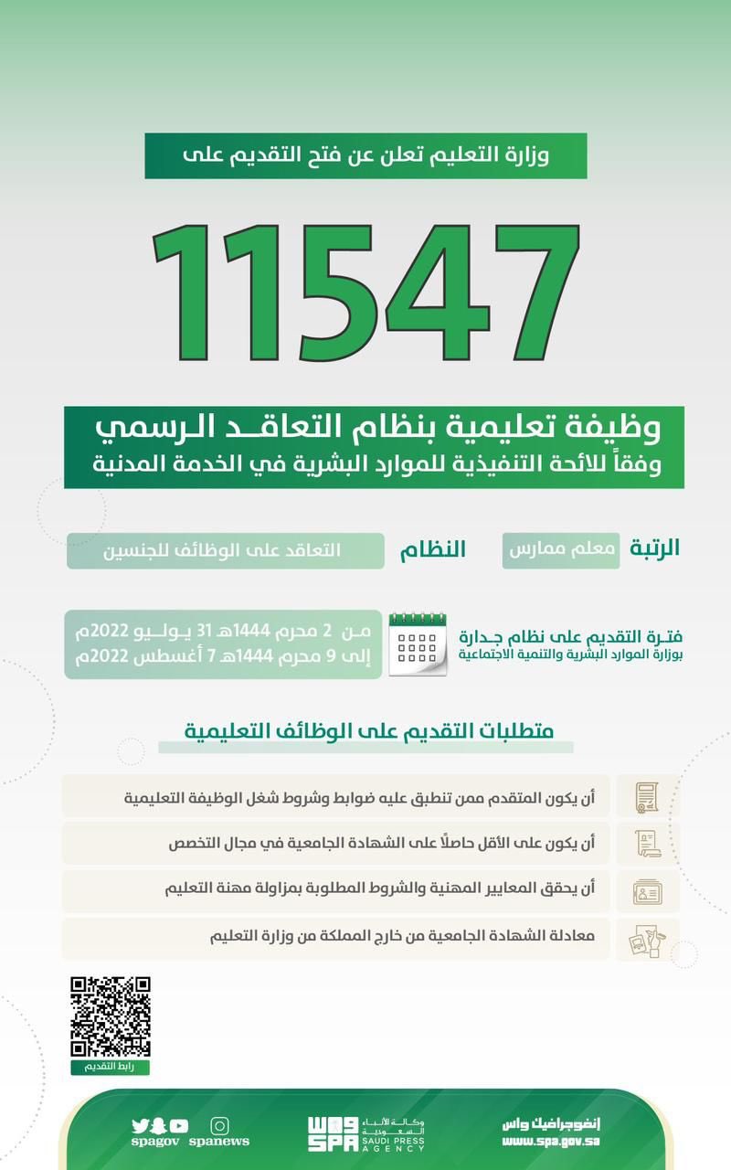 أعلنت وزارة التعليم موعد فتح باب التقديم على (11547) وظيفة تعليمية، بنظام التعاقد الرسمي وفقاً للائحة التنفيذية للموارد البشرية في الخدمة المدنية على رتبة (معلم ممارس) للعام الدراسي 1444هـ، التي تأتي للمزيد من الإسهام في تحقيق الأهداف الإستراتيجية لوزارة التعليم من خلال الاستثمار بشكل فاعل في الكوادر البشرية لقطاع التعليم، ومواكبة استمرار تحسين وتجويد نواتج التعلّم المعرفية والمهارية، وسد الاحتياج الوظيفي لما تم في المشاريع التطويرية لقطاع التعليم، والتي توفر الكفاءات لاحتياج المواد الجديدة في الخطط الدراسية المطورة ومسارات الثانوية العامة التخصصية في العام الدراسي القادم، تطلعاً لتحقيق المزيد من المستهدفات الوطنية لتطوير وتعظيم كفاءة منظومة التعليم ومخرجاتها العائدة على مصلحة الطلاب والطالبات وبناء مستقبل مشرق لهم وللوطن.