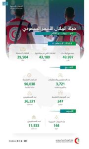 باشرت هيئة الهلال الأحمر السعودي ممثلة بفرقها الإسعافية والطبية 43180 حالة إسعافية ومرضية وقدمت لها الرعاية المطلوبة فيما قامت بنقل 29504 حالة منها إلى منشآت طبية وتقديم الرعاية الطارئة لها.