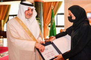 ونوه سموه بالدور المهم للمرأة السعودية في تنمية الوطن كشريك أساسي في مختلف المجالات الثقافية والاجتماعية والتنموية وغيرها من المجالات،موجهاً سموه بتقديم الدعم والتسهيلات لرائدة الأعمال منى الهويدي.