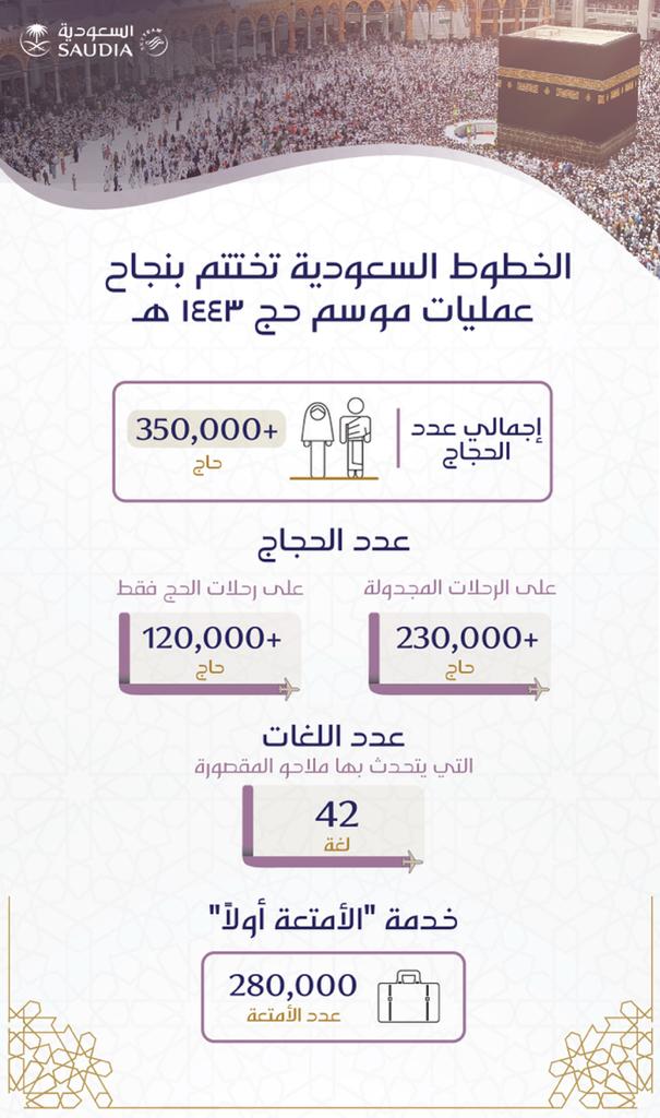 الخطوط السعودية تُتم عملياتها التشغيلية لموسم الحج وتودّع آخر رحلة