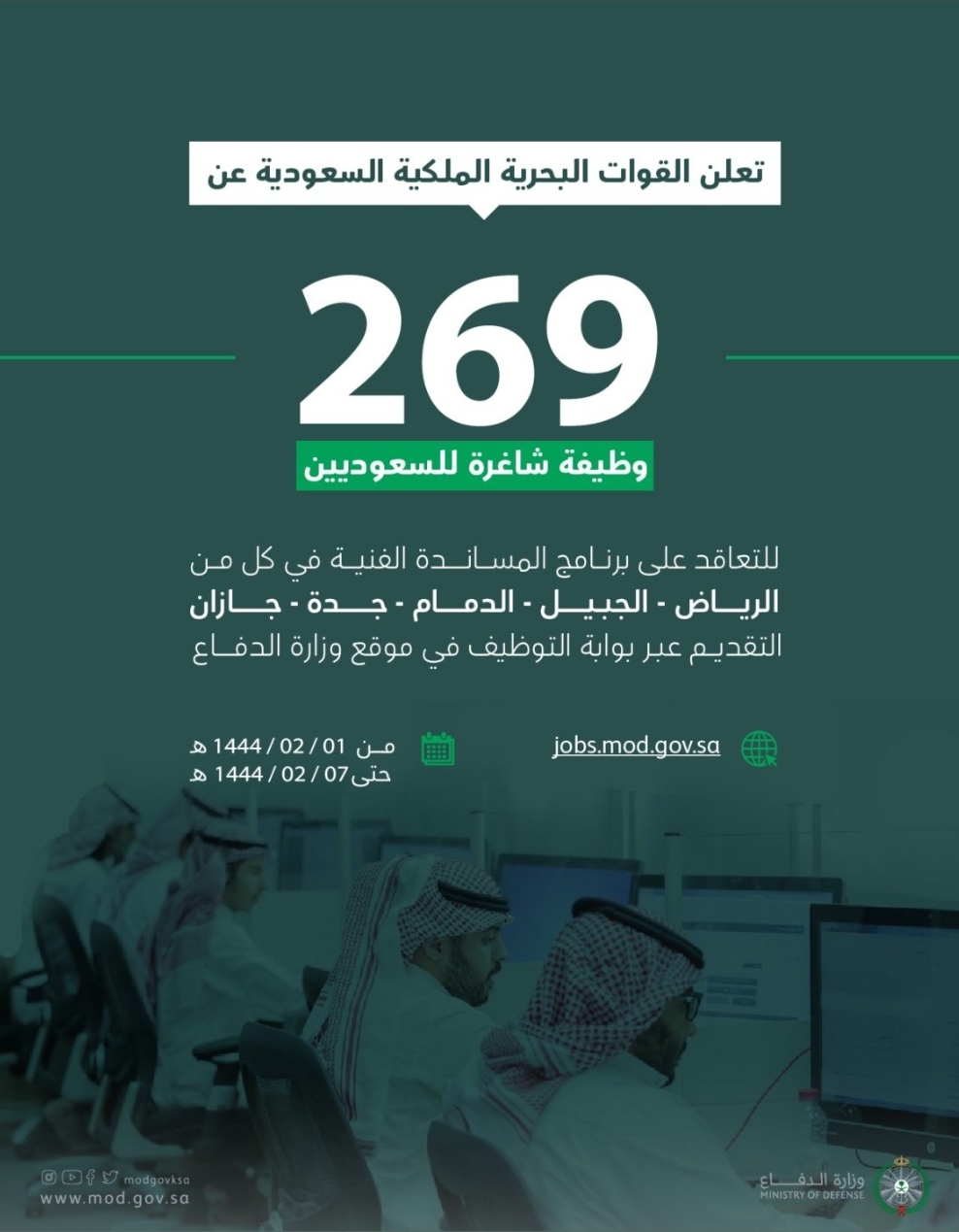 أعلنت القوات البحرية الملكية السعودية عن رغبتها في شغل (269) وظيفة للسعوديين عن طريق التعاقد على برنامج المساندة الفنية في كل من: الرياض، الجبيل، الدمام، جدة، وجازان.