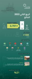 حققت وحدة أعمال الضيافة إيرادات بلغت 27 مليون ريال سعودي، بزيادة قدرها 93% في الربع الثاني من عام 2022 مقارنة بالربع نفسه من عام 2021. ويعزى ذلك إلى ارتفاع معدلات الإشغال في عقارات “سيرا” في مكة المكرمة بسبب زيادة الطلب على الحج والعمرة والنمو المطرد الذي شهده فندقان تابعان لعلامة “تشويس” التجارية في جدة منذ افتتاحهما في يناير من هذا العام.