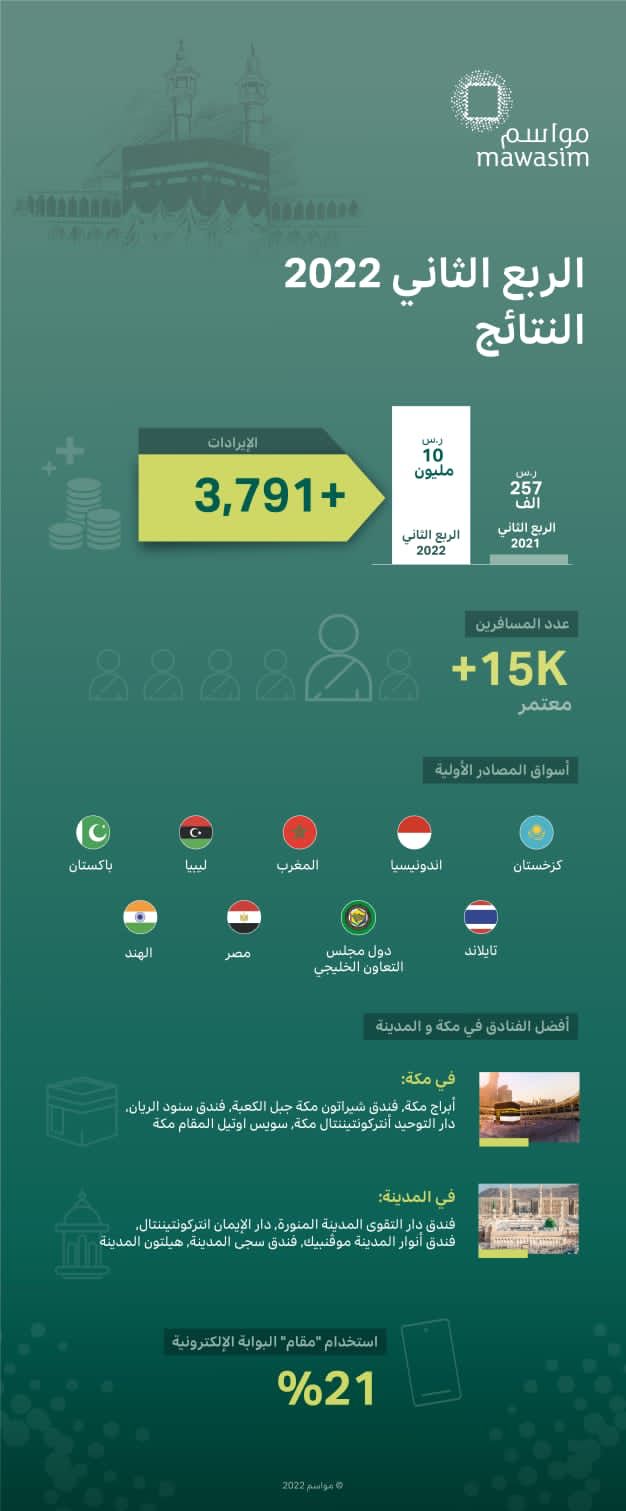 وسجلت رحلات الحج والعمرة إيرادات بقيمة 10 ملايين ريال سعودي للربع الثاني من عام 2022، وهي زيادة كبيرة عن الربع الثاني من عام 2021. وكانت هذه الزيادة مدفوعة بعودة الطلب على أداء مناسك العمرة بعد أن تم رفع أو تخفيف القيود المفروضة بسبب الجائحة وفق تقرير ”مواسم“