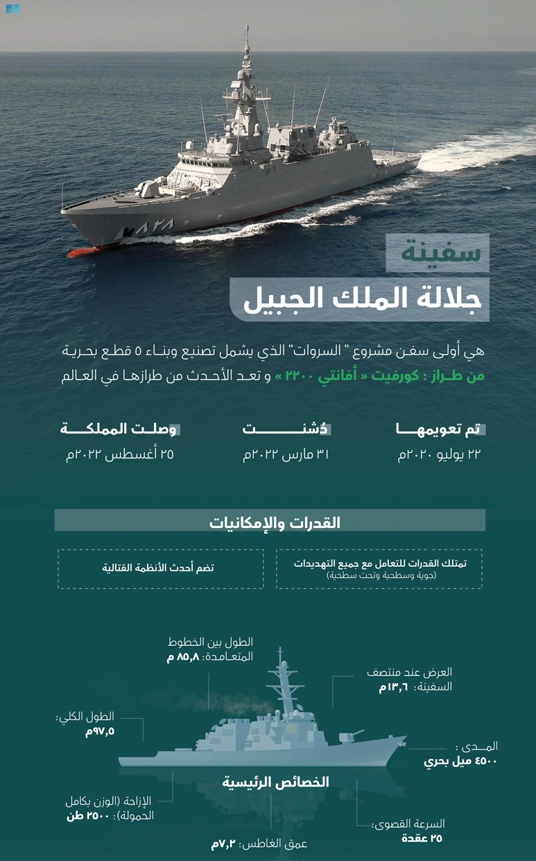 وأقامت القوات البحرية، مراسم استقبال رسمية لسفينة جلالة الملك «الجبيل»، أولى السفن التي تدخل الخدمة من «مشروع السروات» الذي يشتمل على تصنيع وبناء خمس قطع بحرية بقدرات نوعية للتعامل مع مختلف المهام القتالية بقدرة وكفاءة عالية.