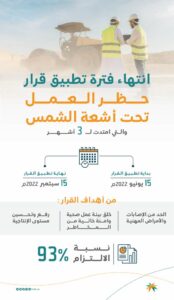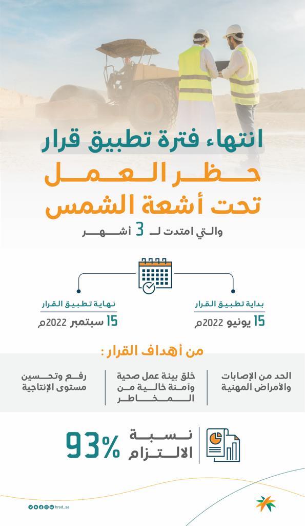 أعلنت وزارة الموارد البشرية والتنمية الاجتماعية عن انتهاء الفترة الزمنية الخاصة بتطبيق القرار الوزاري رقم (3337) وتاريخ 15 / 7 / 1435 هـ، القاضي بحظر العمل تحت أشعة الشمس، على جميع منشآت القطاع الخاص، والذي استغرقت مدة تطبيقه ثلاثة أشهر ابتداءً من يوم الأربعاء 16 ذو القعدة 1443 هـ الموافق 15 يونيو 2022 م، وانتهاءً بهذا اليوم الخميس 19 صفر 1444 هـ الموافق 15 سبتمبر 2022 م.