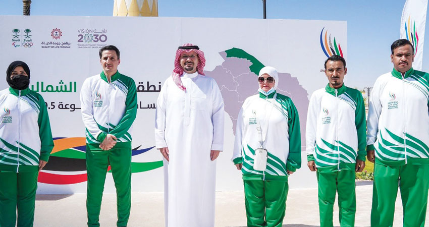أمير الحدود الشمالية والتمياط يتوسطان مجموعة من الرياضيين خلال مراسم استقبال الشعلة (الشرق الأوسط)