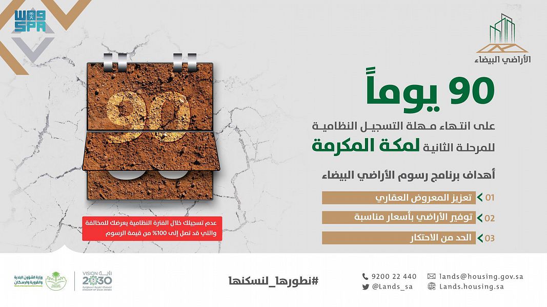 وأضاف أن جميع ملاك الأراضي البيضاء الواقعة داخل النطاقات الجغرافية للمدن التي تُطبق فيها رسوم الأراضي البيضاء مطالبون بتسجيل أراضيهم عبر البوابة الإلكترونية بما فيهم ملاك الأراضي البيضاء المطورة في مكة المكرمة وجدة وحاضرة الدمام، وذلك قبل انتهاء مهلة التسجيل النظامية للمرحلة الثانية بعد 90 يوماً.