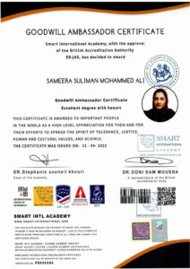 منحت أكاديمية سمارت الدولية وبموافقة هيئة الإعتماد البريطانية EB-JAS شهادة سفيرة النوايا الحسنة ، للإعلامية سميرة سليمان محمد كتقدير رفيع المستوى لها لما بذلته لنشر روح التسامح والعدالة والقيم الإنسانية ولثقافية والعلم .