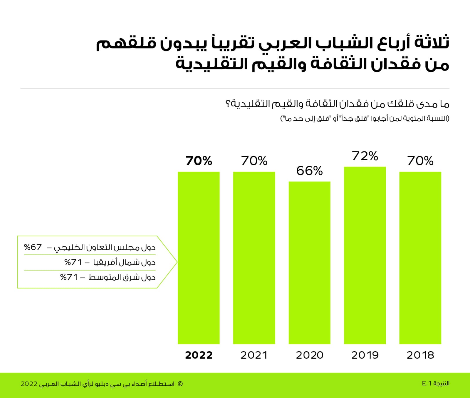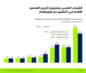 وأكد معظم الشبان والشابات السعوديون التمسك بثقافتهم وقيمهم التقليدية بحسب نتائج الاستطلاع. ويعتبر أكثر من ثلثي الشباب السعودي (69٪) أن الدين هو العنصر الأهم في التعبير عن هويتهم، في حيث يرى 82٪ أن الحفاظ على هويتهم الدينية والثقافية أهم من بناء مجتمع أكثر عولمة.