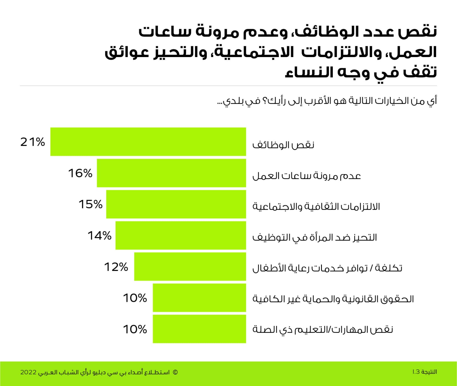 وفي مواجهة التصورات النمطية الغربية عن المملكة العربية السعودية، يقول أكثر من ثلثي الشباب السعوديين (68٪) أن الرجال والنساء يتمتعون بحقوق متساوية، ويقول 61٪ إنهم متساوون أيضاً في فرص العمل. ويرى 96٪ أن حضور النساء بشكل أكبر في سوق العمل سيعود بالنفع على المملكة.