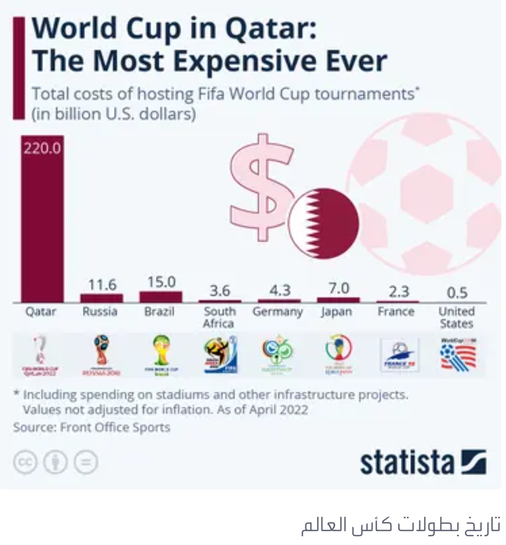 وأوضحت البيانات التي جمعتها “Statista” أن كأس العالم لهذا العام في قطر هي الأغلى على الإطلاق، وبفارق صارخ، إذ ستبلغ التكلفة الإجمالية للبطولة الفلكية حوالي 220 مليار دولار، وهو ما يتجاوز جميع التكاليف التاريخية للبطولة تقريباً.