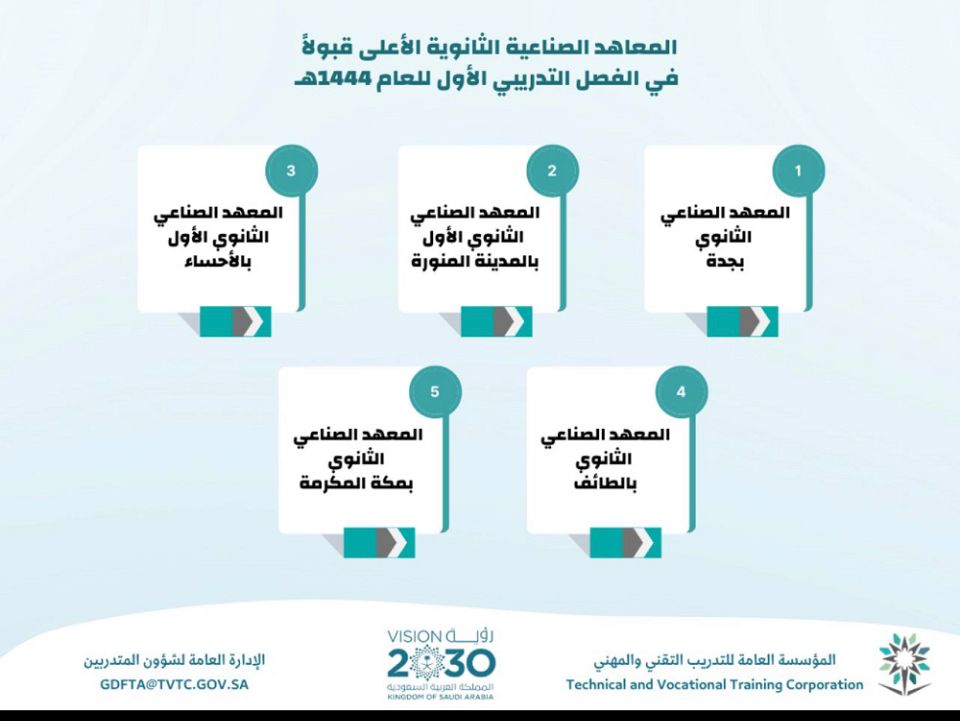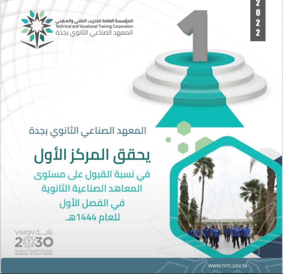 حقق المعهد الصناعي الثانوي بجدة المركز الأول في نسبة القبول على مستوى المعاهد الصناعية الثانوية في الفصل الأول للعام 1444هـ . وهذا النجاح يدل على الإمكانات المتوفرة في المعهد وكفاءة المدربين والإدارة الحكيمة .