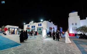 وتبرز تفاصيل بناء متاجر المهرجان وزواياه بأناقةٍ تتضاعف جمالياتها بتأثيرات الأضواء الليلية على جدرانه، وانعكاسات ألوان اللوحات على أبوابه، وإسهامها في منح المكان روحًا جمالية، وحيوية فريدة، وسط أجواء نابضة بالحياة، وعددًا من مظاهر الترفيه والتسوق.