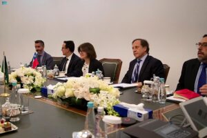 حضر جلسة المباحثات وكيل وزارة الخارجية للشؤون السياسية السفير الدكتور سعود الساطي، وسفير جمهورية تشيلي لدى دولة الإمارات العربية المتحدة (غير المقيم) لدى المملكة باتريسيو دياز برويتون.