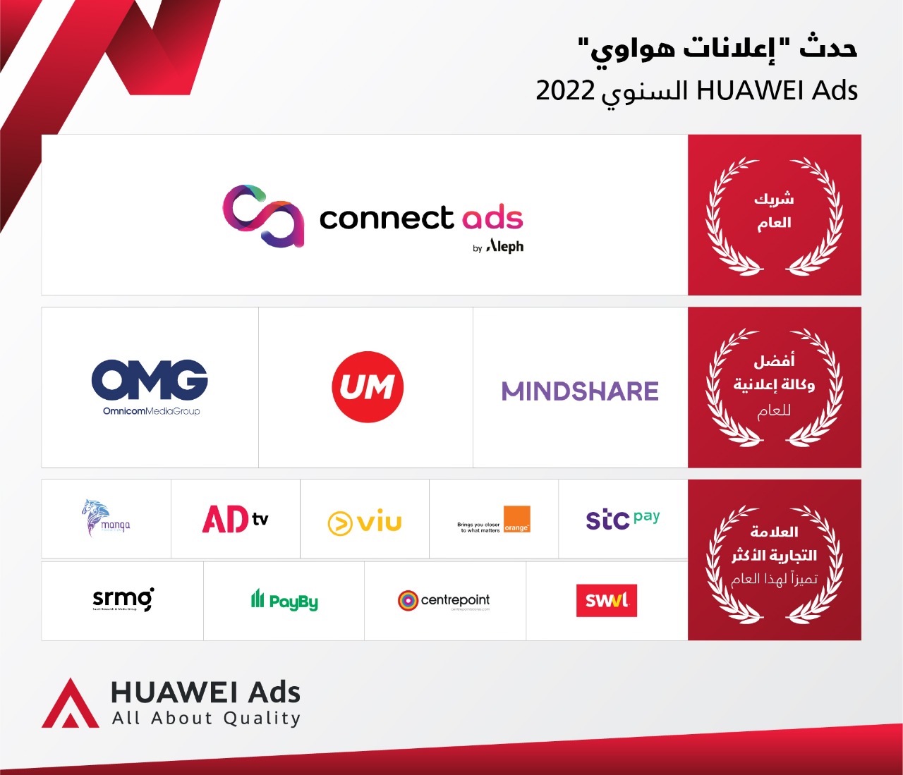 وفي إطار حدثها السنوي، كرّمت “إعلانات هواوي” HUAWEI Ads أيضاً شركاءها الأكثر تميّزاً في منطقة الشرق الأوسط وأفريقيا، وذلك تقديراً لمساهماتهم في نجاح المنصة. فقد نالت وكالة الإعلان “كونيكتد أدز” Connected Ads جائزة “شريك العام”، في حين فازت كل من “يوم إم”UM و”اومنيكوم ميديا جروب” Omnicom Media Group و”مايندشير” Mindshare للإعلان بجائزة “أفضل وكالة إعلانية للعام”. وإلى جانب ذلك، حصلت كل من “اس دبليو في إل” SWVL و”أورانج مصر ” Orange Egypt” و”فيو” Viu والمجموعة السعودية للأبحاث والإعلام ومنصةstc pay وشركة مانجا للانتاج و”سنتربوينت” وتلفزيون أبوظبي ADTV، و”باي باي” PayBy على جائزة “العلامة التجارية الأكثر تميزاً لهذا العام”.