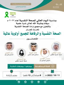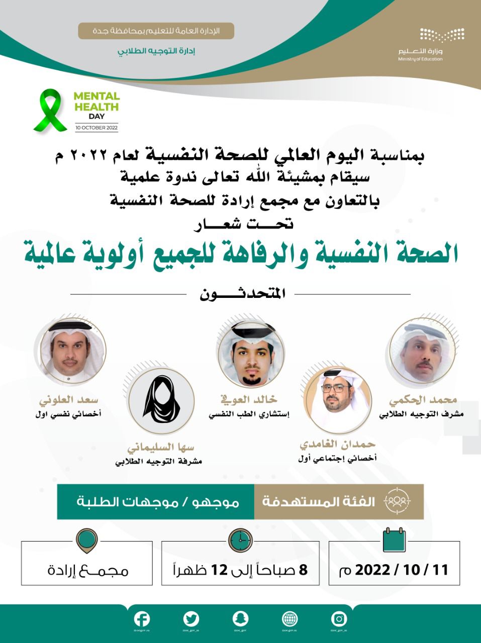 تحت شعار جعل الصحة النفسية والرفاهية للجميع أولوية عالمية دشن مجمع إرادة والصحة النفسية لخدمات إرادة بجدة فعالية اليوم العالمي للصحة النفسية 2022م الذي يصادف العاشر من أكتوبر عبر حملة ومجموعة من الفعاليات والمحاضرات والندوات والمعارض الميدانية الداخلية والخارجية بالتعاون مع العديد من الجهات والمنشآت الحكومية ومنها تعليم جدة والمديرية العامة لحرس الحدود والشؤون الإجتماعية وغيرها بهدف التعريف بشعار العام وأن السعادة والرفاهية هي السلوك الأبرز والأهم في ظل المتغيرات والمؤثرات والتحول الذي يطرأ على الفرد والأسرة والمجتمع والعمل على ترسيخ الخطوات التوعوية والتثقيفية والترفيهية والعلاجية المناسبة لمواكبة المحافظة على الطرق المناسبة لضمان الأمان والإستقرار المجتمعي.
