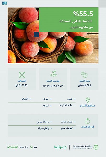 أعلنت وزارة البيئة والمياه والزراعة، عن وصول إنتاج المملكة من فاكهة الخوخ إلى 22.2 ألف طن سنويًّا، محقّقًة بذلك اكتفاءً ذاتيًّا منه بنسبة 55.5%، مشيرة إلى أن الخوخ يُزرع في أكثر من خمس مناطق بالمملكة، في مساحة إجمالية تُقدّر بـ1285 هكتارًا.