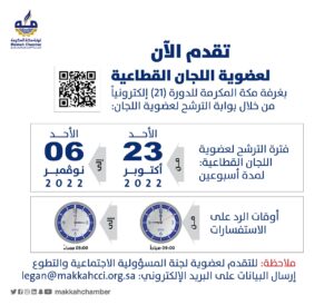 وحددت غرفة مكة المكرمة أوقات تلقي الاستفسارات يومياً من التاسعة صباحاً حتى الثالثة مساء، أو بالاتصال على الرقم 0125343838 ، وحددت للتقدم لعضوية لجنة المسؤولية الاجتماعية والتطوع إرسال البيانات على البريد الالكتروني ([email protected]). ولمعرفة آلية التسجيل في البوابة لعضوية اللجان القطاعية والاطلاع على الشروط والاحكام وضعت الرابط التالي ( http://committees.makkahcci.org.sa).