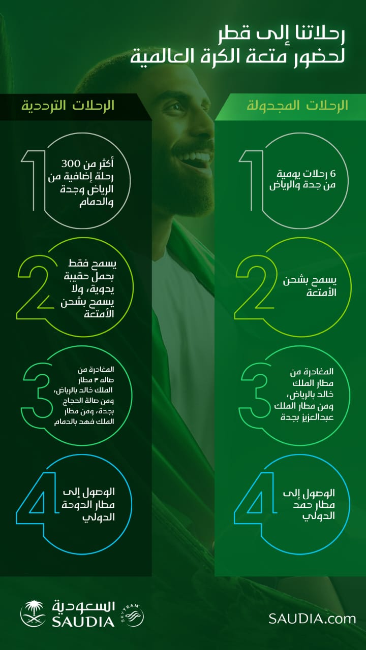 ويمكن للضيوف الاستفادة من الرحلات الترددية اليومية والتي تأتي دعماً لجمهور المنتخب السعودي وكل محبي كرة القدم، حيث ستساعدهم على التخطيط الأمثل لسفرهم بإمكانية الوصول لمطار الدوحة والعودة في نفس اليوم دون الحاجة إلى الإقامة في الفنادق والاكتفاء بالأمتعة الشخصية فقط داخل الطائرة مما يسرع إجراءات السفر، كما يمكن للضيوف السفر من وإلى مطار حمد الدولي عبر رحلاتها المجدولة مع إمكانية اصطحاب الأمتعة المعاينة.