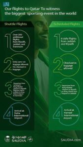 وأكملت الخطوط السعودية استعداداتها لنقل الجمهور الرياضي بين المملكة وقطر لمتابعة بطولة كأس العالم لكرة القدم 2022، حيث توفر طوال فترة البطولة مما يمكن للمسافرين الاستفادة من الرحلات الترددية اليومية التي تأتي دعمًا لجمهور المنتخب السعودي ومحبي كرة القدم، لتساعدهم على التخطيط الأمثل لسفرهم بإمكانية الوصول لمطار الدوحة والعودة في نفس اليوم دون الحاجة إلى الإقامة في الفنادق والاكتفاء بالأمتعة الشخصية فقط داخل الطائرة مما يسرع إجراءات السفر، كما يمكن للمسافرين من وإلى مطار حمد الدولي عبر رحلاتها المجدولة مع إمكانية إصطحاب الأمتعة المعاينة.