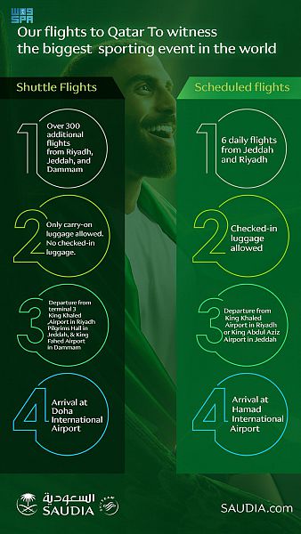خصصت الخطوط السعودية أكثر من 780 رحلة مجدولة وإضافية ترددية لنقل الجمهور الرياضي بين المملكة والدوحة لحضور مباريات مونديال كأس العالم عبر مطارات الرياض وجدة والدمام إلى مطاري حمد والدوحة الدوليَين بسعة مقعدية تجاوزت 254 ألف مقعدًا.