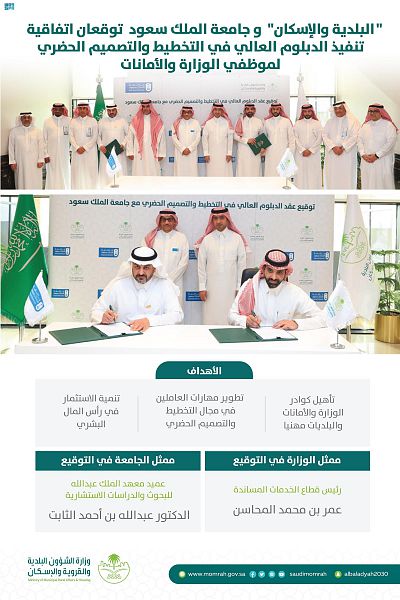 أبرمت وزارة الشؤون البلدية والقروية والإسكان وجامعة الملك سعود، اليوم، عقد تنفيذ برنامج الدبلوم العالي في التخطيط والتصميم الحضري لموظفي الوزارة وأمانات المناطق والبلديات التابعة لها، برعاية معالي وزير الشؤون البلدية والقروية والإسكان الأستاذ ماجد بن عبدالله الحقيل ومعالي رئيس جامعة الملك سعود الدكتور بدران بن عبدالرحمن العمر.