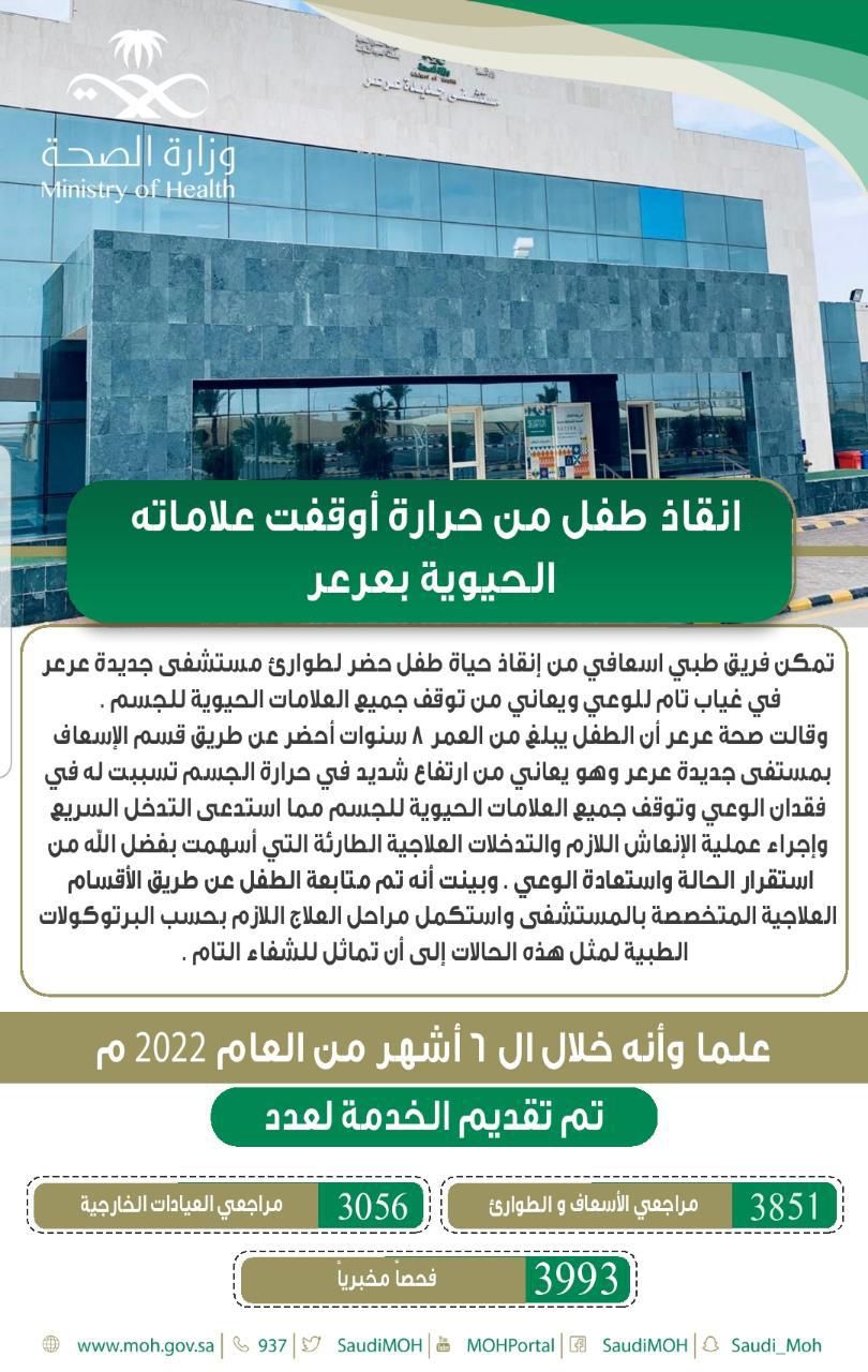 تمكن فريق طبي اسعافي من إنقاذ حياة طفل حضر لطوارئ مستشفى جديدة عرعر في غياب تام للوعي مع توقف جميع العلامات الحيوية للجسم . وقالت صحة عرعر أن الطفل يبلغ من العمر 8 سنوات أحضر عن طريق قسم الإسعاف بمستشفى جديدة عرعر وهو يعاني من ارتفاع شديد في حرارة الجسم مما سبب له فقدان الوعي وتوقف جميع العلامات الحيوية للجسم مما استدعى التدخل السريع وإجراء عملية الإنعاش اللازم والتدخلات العلاجية الطارئة التي أسهمت بفضل الله من استقرار الحالة واستعادة الوعي .