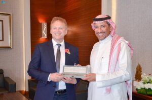 وجرى – خلال اللقاء- مناقشة تعزيز العلاقات الثنائية بين المملكتين في قطاعي الصناعة والتعدين، وتبادل الآراء حول عدد من الموضوعات التي تهم البلدين، بما يسهم في رفع مستوى التعاون في القطاعين.