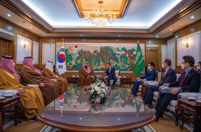 حضر جلسة المباحثات، صاحب السمو الملكي الأمير عبدالعزيز بن سلمان بن عبدالعزيز وزير الطاقة، وصاحب السمو الملكي الأمير تركي بن محمد بن فهد بن عبدالعزيز وزير الدولة عضو مجلس الوزراء، وصاحب السمو الملكي الأمير عبدالعزيز بن سعود بن نايف بن عبدالعزيز وزير الداخلية، وصاحب السمو الملكي الأمير عبدالله بن بندر بن عبدالعزيز وزير الحرس الوطني، وصاحب السمو الملكي الأمير خالد بن سلمان بن عبدالعزيز وزير الدفاع، وصاحب السمو الأمير فيصل بن فرحان بن عبدالله وزير الخارجية، ومعالي وزير الدولة عضو مجلس الوزراء مستشار الأمن الوطني الدكتور مساعد بن محمد العيبان، ومعالي وزير التجارة وزير الإعلام المكلف الدكتور ماجد بن عبدالله القصبي، ومعالي وزير الاستثمار المهندس خالد بن عبدالعزيز الفالح، ومعالي وزير الاقتصاد والتخطيط الأستاذ فيصل بن فاضل الإبراهيم، ومعالي محافظ صندوق الاستثمارات العامة الأستاذ ياسر بن عثمان الرميان، ومعالي سكرتير سمو ولي العهد الدكتور بندر بن عبيد الرشيد، وسفير خادم الحرمين الشريفين لدى كوريا سامي بن محمد السدحان، والوفد الرسمي الكوري.