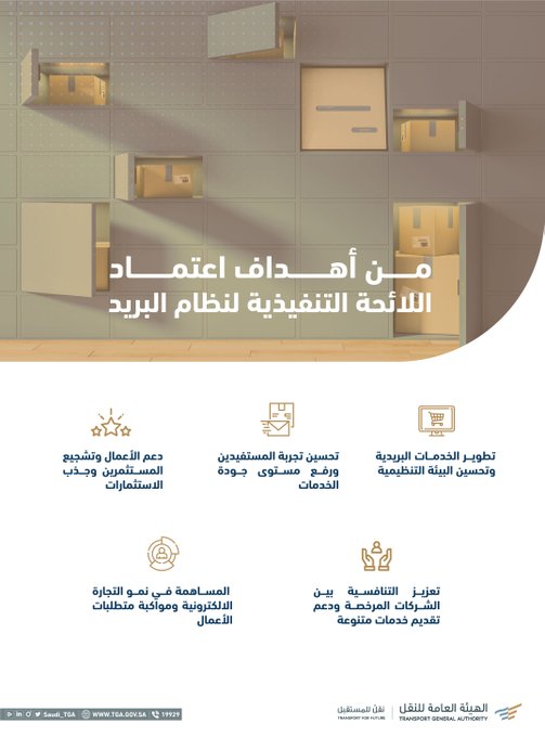 أصدر معالي وزير النقل والخدمات اللوجستية، رئيس مجلس إدارة الهيئة العامة للنقل، المهندس صالح بن ناصر الجاسر، قراراً باعتماد اللائحة التنفيذية لنظام البريد، التي توضّح أحكام نظام البريد، الهادف إلى تنظيم القطاع وخلق البيئة التنافسية بين الشركات والإسهام في نمو التجارة الإلكترونية وتطوير قطاع الخدمات البريدية اللوجستية، وتحسين تجربة العملاء مع القطاع البريدي في المملكة.