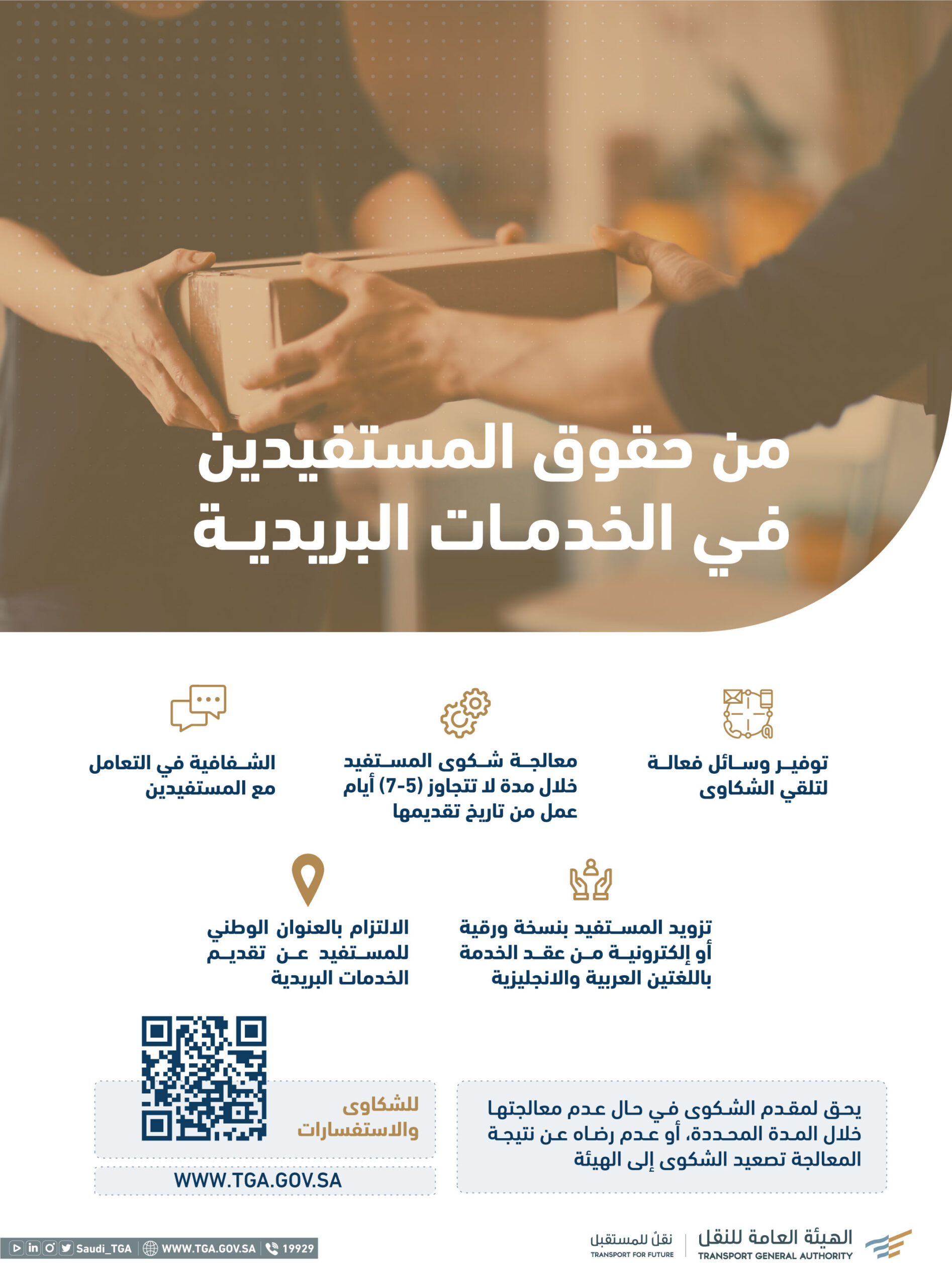 وتحرص الهيئة العامة للنقل إلى تهيئة جميع السبل والوسائل لتطوير قطاع البريد وتحسين تجربة المستفيدين والارتقاء بجودة الخدمات المقدمة، كما توفر الهيئة قنوات التواصل معها عبر الرقم الموحد لها: 19929 لجميع المستفيدين والمهتمين بالخدمات البريدية.