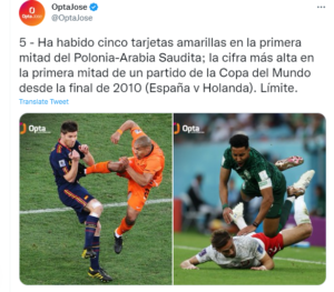 وبحسب شبكة أوبتا للإحصائيات، كانت هناك خمس بطاقات صفراء في الشوط الأول من مباراة بولندا والسعودية، أعلى رقم فى النصف الأول من مباراة كأس العالم منذ نهائي 2010 (إسبانيا ضد هولندا).