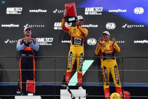 وفي السباق الأول، استغل الفرنسي نثنائيل بيرثون، سائق فريق كومتويو دي إتش إل أودي سبورت، الانطلاقة من المركز الأول وحافظ على مركزه طوال السباق الذي امتد لمدة 30 دقيقة، متقدماً على المجري نوربرت ميشيلز سائق فريق بي آر سي هيونداي إن سكودرا كورس، لينهي السباق في المركز الأول للمرة الثانية له هذا الموسم ويصبح على بُعد 5 نقاط فقط من صاحب المركز الثاني في الترتيب العام الأرجنتيني نستور غيرولامي، سائق أول إينك دوت كوم ميونخ موتور سبورت.