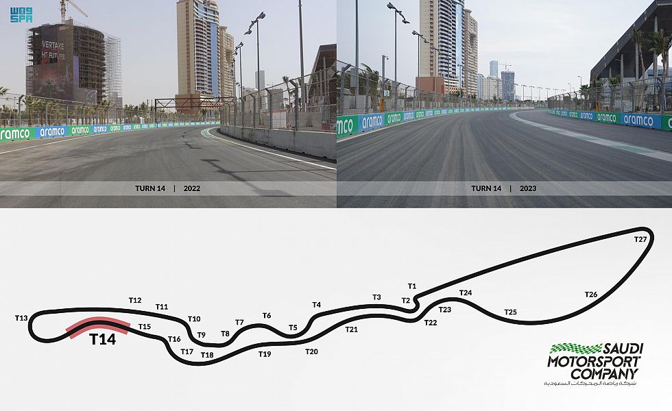 كما تم تعديل جدار الأمان في المنعطفين (8 و10) لمنح السائقين مجالاً أوضح من الرؤية للمنعطف في الأمام، كما شهد المنعطفان (22 و23) تغييراً على شكلهما الذي يتخذ شكل “S” بضغطها قليلاً عبر تعديل السياج في المنعطف 23 وإضافة حافة جانبية؛ بهدف إبطاء السائقين إلى نحو (50 كم/ ساعة)، وإلى جانب التغييرات على مسار السباق، تواصل حلبة كورنيش جدة نموها لتصبح موطناً جديداً للفعاليات الرياضية والترفيهية.