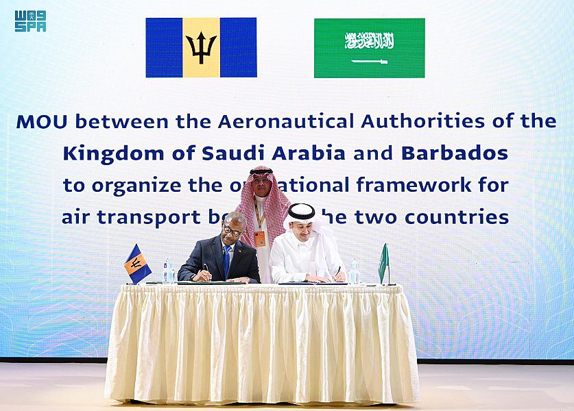 وقع معالي وزير النقل والخدمات اللوجستية رئيس مجلس إدارة الهيئة العامة للطيران المدني المهندس صالح بن ناصر الجاسر اليوم، مذكرة تفاهم لتنظيم الإطار التشغيلي للنقل الجوي والتأشير على مشروع اتفاقية في مجال خدمات النقل الجوي بين حكومة المملكة العربية السعودية وحكومة باربادوس، التي مثلها معالي وزير السياحة والنقل الدولي إيان جودينج إدجيل، بحضور معالي رئيس الهيئة العامة للطيران المدني الأستاذ عبدالعزيز بن عبدالله الدعيلج، وذلك على هامش فعاليات القمة العالمية للمجلس العالمي للسفر والسياحة (WTTC) في نسختها الثانية والعشرين والمقامة في الرياض.
