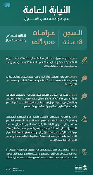 وقد تم إيقاف المتهمين، والادعاء عليهم أمام المحكمة المختصة، وتقديم الأدلة على اتهامهم، وصدر الحكم القضائي المتضمن إدانتهم بما نسب إليهم، وأن الكيانات التجارية غطاء لتحويل الأموال مجهولة المصدر إلى خارج المملكة، والحكم عليهم بالسجن لمدة بلغت (18) سنة، وغرامات مالية بلغت (500.000) ريال، ومصادرة قيمة مماثلة للأموال التي تمت عليها الجريمة والمتحصلات منها وعائداتها، وإبعاد الوافد عن البلاد بعد انتهاء محكوميته.
