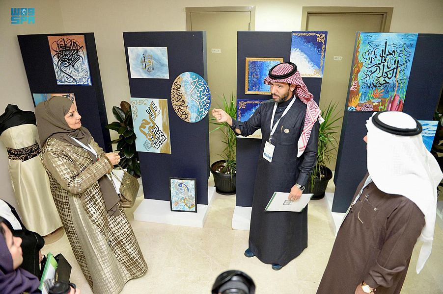 وتضمن الحفل معرضًا فنيًّا إبداعيًّا نظمته طالبات كلية الاقتصاد المنزلي بالجامعة، الذي تم خلاله استعراض عدد من الأعمال الفنية التي خُطت فيها أبجدية “لغة الضاد” على الأقمشة واللوحات، بالإضافة إلى توظيف حروف اللغة العربية في تجميل أزياء الأطفال؛ لتسليط الضوء على واحد من مجالات الفنون التي أسهمت في توظيف أبجدية اللغة، بالإضافة إلى تنوع زخرفات الحروف والخطوط العربية.