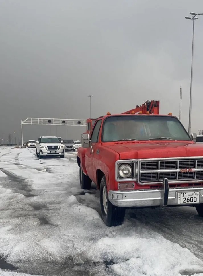 وتناقل مستخدمون عبر وسائل التواصل الاجتماعي صورا ومقاطع فيديو اكتست فيها الطرقات باللون الابيض في الكويت.