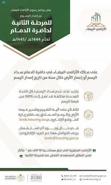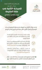 ونوه البرنامج أن المادة الخامسة عشر من اللائحة التنفيذية لرسوم الأراضي البيضاء تنص على أن المبالغ التي يتم تحصيلها تُصرف لتطوير مشروعات البنية التحتية وفق النص الآتي: “تحدد الوزارة أوجه الصرف من الحساب الخاص بمبالغ الرسوم والغرامات المحصلة على مشروعات الإسكان، وإيصال المرافق العامة إليها، وتوفير الخدمات العامة فيها”، ويمكن الاطلاع على جميع تفاصيل الدورات الفوترية المتعلقة بالمدن الخاضعة للنظام من خلال زيارة الرابط التاليhttps://lands.housing.sa/ar.