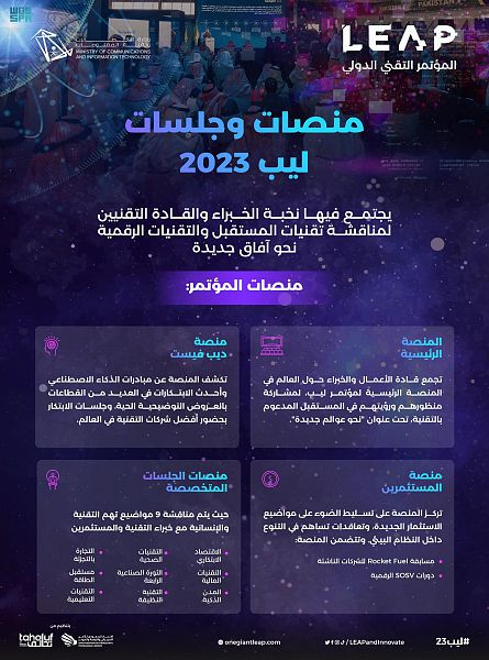 ويأتي مؤتمر ليب 23 بتنظيم من وزارة الاتصالات وتقنية المعلومات بالتعاون مع «الاتحاد السعودي للأمن السيبراني والبرمجة والدرونز» وشركة «تحالف»، حيث تجمع منصاته المبتكرين والتقنيين لتمكين رواد الأعمال، وتعزيز الابتكار التقني وفتح آفاق جديدة بهدف ترسيخ وتعزيز مكانة المملكة كمركز إقليمي للتقنية والابتكار.
