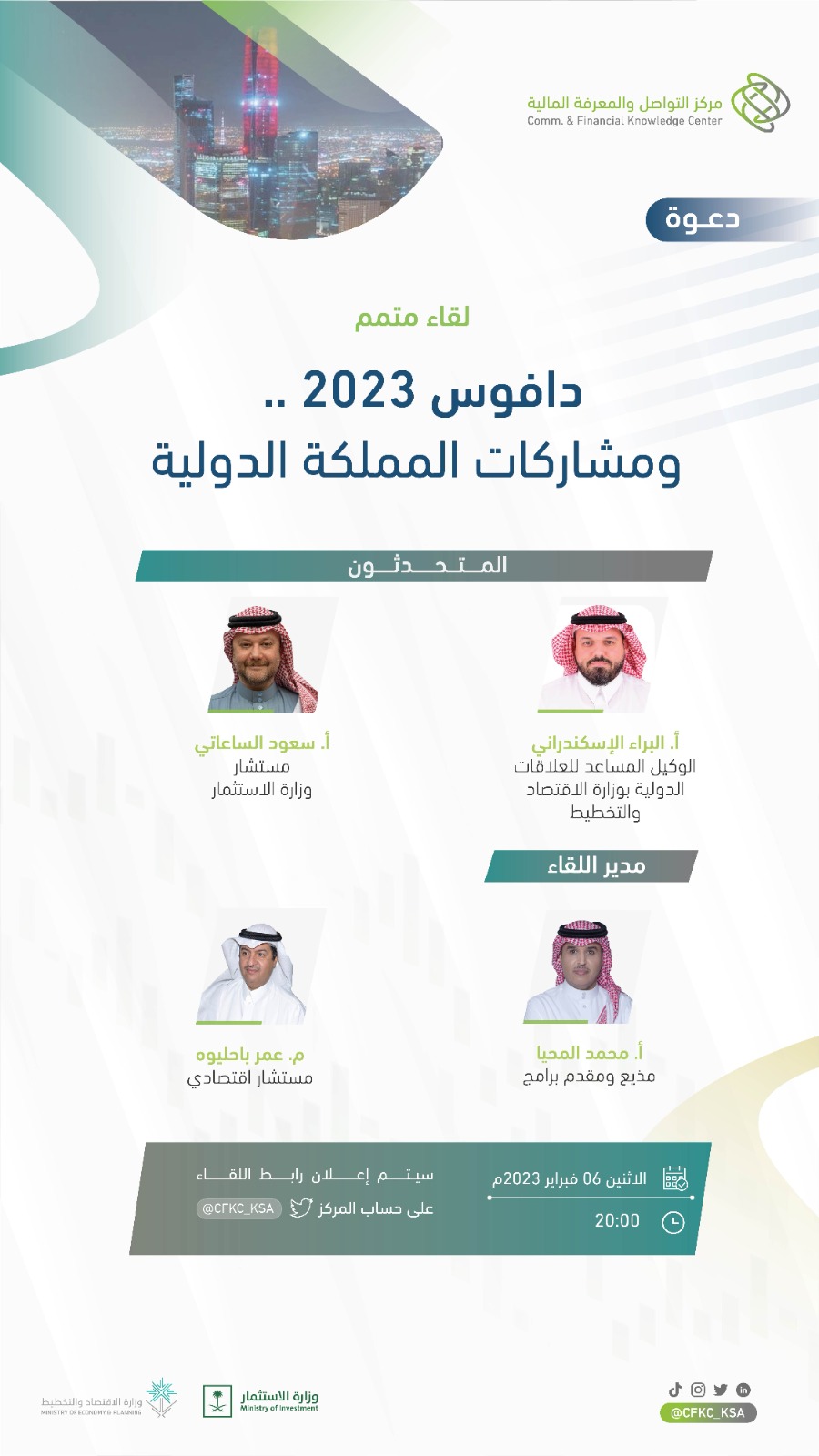 يقيم مركز التواصل والمعرفة المالية “متمّم” يوم غد، لقاءً بعنوان: دافوس 2023.. ومشاركات المملكة الدولية”، بهدف الحديث بشكل واسع عن مشاركات المملكة الدولية ودورها في تعزيز التعاون الدولي.