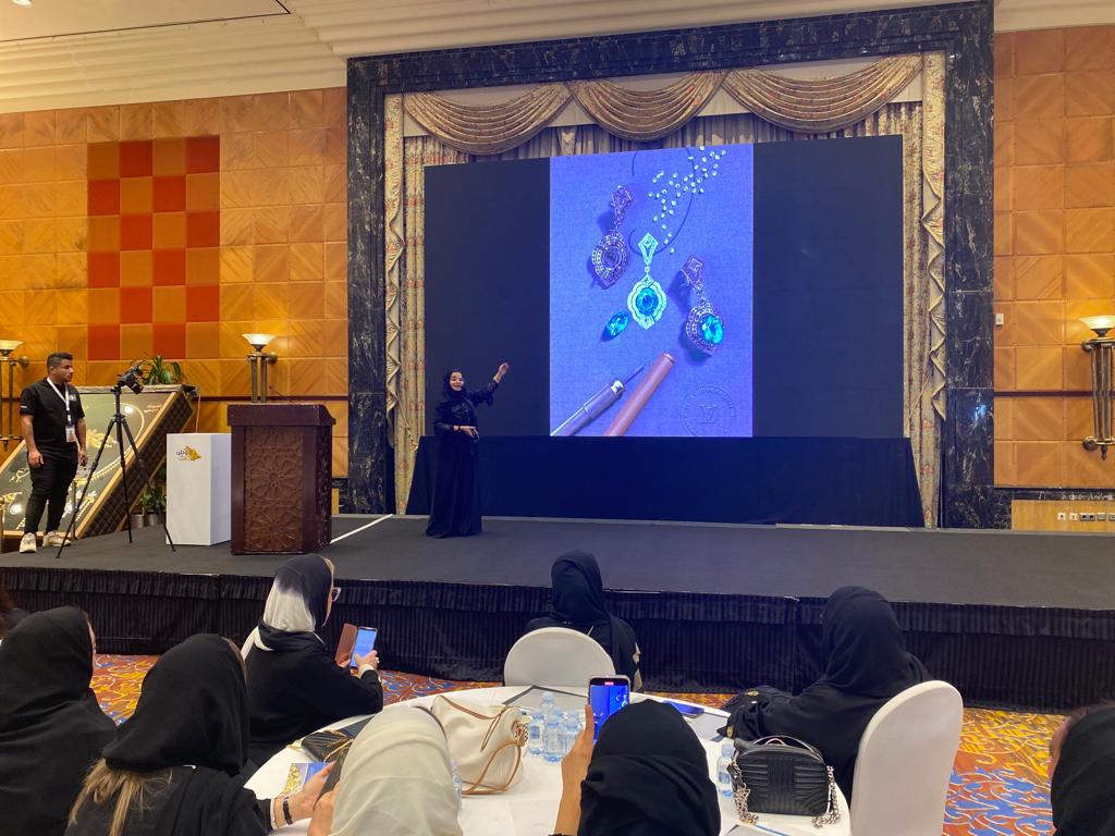 وسلطت رائدة الأعمال حنان عطار في محاضرتها “فنون صناعة المجوهرات” الضوء على تصميم المعدن النفيس، وتطعيم الذهب بالألماس والأحجار الكريمة، وروح المصمم وأهمية الابتكار في وجود التقنيات الحديثة المستخدمة في تصنيع المجوهرات وكيفية تأسيس علامة تجارية “براند” جديد للطامحين والطامحات من عشق الذهب في السعودية.