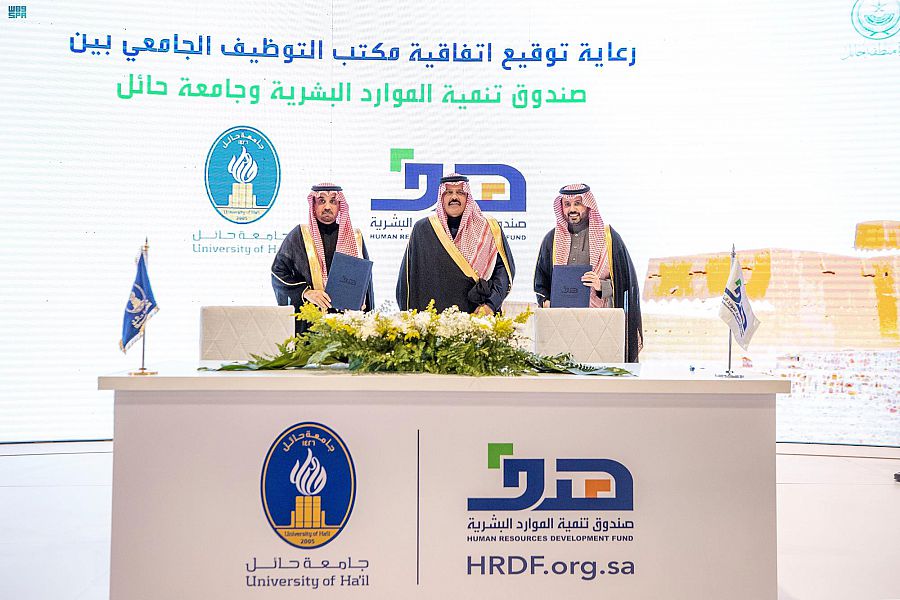 شهد صاحبُ السموِّ الملكي الأمير عبدالعزيز بن سعد بن عبدالعزيز، أمير منطقة حائل بمركز الروشن للمعارض والمؤتمرات أمس، مراسم اتفاقية تعاون بين صندوق تنمية الموارد البشرية (هدف) وجامعة حائل؛ لدعم توظيف خريجي الجامعة والطلاب المتوقَّع تخرجهم؛ بهدف زيادة قدرتهم التنافسية في سوق العمل ورفع نسبة التوظيف، وذلك ضمن مبادرة “هدف” في برنامج دعم مكاتب توظيف الخريجين بالجامعات.