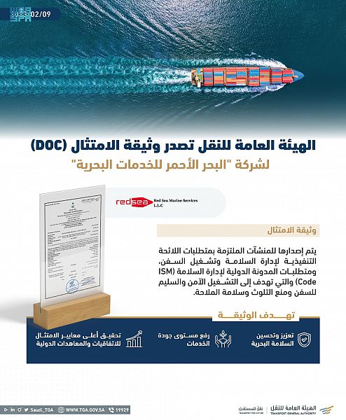 أصدرت الهيئة العامة للنقل وثيقة الامتثال البحري (Document of compliance)، لشركة البحر الأحمر للخدمات البحرية كإحدى الشركات الوطنية الممتثلة والملتزمة بمتطلبات اللائحة التنفيذية لإدارة السلامة وتشغيل السفن ومتطلبات المدونة الدولية لإدارة السلامة (Code ISM)، التي تهدف إلى تعزيز وتحسين السلامة البحرية والتشغيل الآمن والسليم للسفن ومنع التلوث وسلامة الملاحة، ورفع مستوى جودة الخدمات المقدمة، وتحقيق أعلى معايير الامتثال للاتفاقيات والمعاهد الدولية.