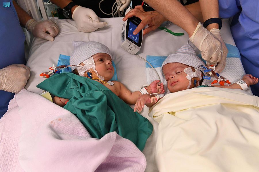 إنفاذاً لتوجيهات خادم الحرمين الشريفين الملك سلمان بن عبدالعزيز آل سعود وسمو ولي عهده الأمين – حفظهما الله – تمكن الفريق الجراحي المختص بحمد الله من فصل التوأم السيامي اليمني ” سلمان وعبدالله” أبناء يوسف عيد محمد الملاحي، الملتصقين بمنطقة البطن والحوض ويشتركان بالأمعاء والجهاز البولي والتناسلي مع ضمور لفتحة الشرج والجدار السفلي للبطن وتشوه واشتراك بين المثانة والقولون، وذلك بعد عملية جراحية دقيقة استغرقت 8 ساعات ونصف، نُفذت على ست مراحل، وشارك فيها 35 من الاستشاريين والاختصاصيين في مجالات التخدير وجراحة الأطفال وجراحة المسالك البولية والتجميل والعظام، بالإضافة إلى الكوادر التمريضية والفنية.