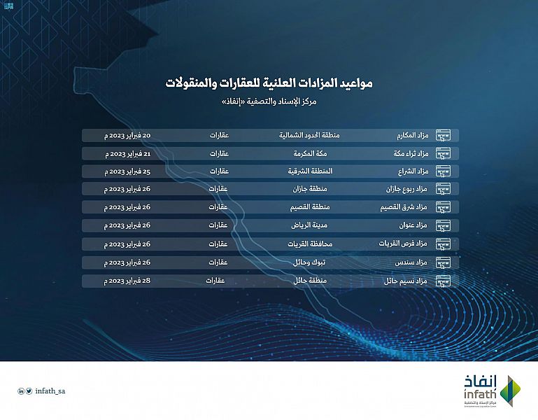 أعلن مركز الإسناد والتصفية “إنفاذ” عن إقامة 19 مزادًا علنيًا تتنوع ما بين مزادات حضورية وإلكترونية؛ لبيع ما يتجاوز 130 عقارًا و 28 سيارة بمختلف مناطق المملكة، وذلك في الفترة ما بين 19 إلى 26 فبراير 2023م.