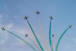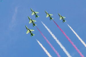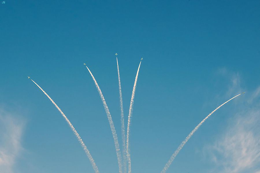واستعرض فريق الصقور المكوَّن من سبع طائرات مهاراته في سماء الكويت بعروض مبهرة أظهرت المستوى العالي لقدرات الطيارين السعوديين، وشكلوا لوحات فنية واشتملت على السيفين والنخلة شعار المملكة العربية السعودية وألوان علم دولة الكويت، التي جسَّدت عمق العلاقات المتميزة التي تربط البلدين الشقيقين.
