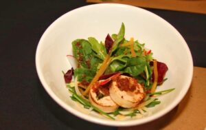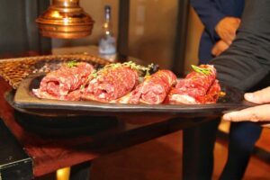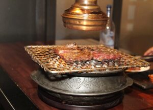 وسلطة الروبيان الكورية تجهز بطبخ الروبيان على البخار بدون تتبيل وبهارات ويضاف لها الكثير من الخضروات ليصبح أكل صحي ومذاقه لذيذ ولونه مثالي. وعندما يكون الموقد جاهز يحضر اللحم على نوعين الأول “سيوسال” والثاني “فلاور ريبس”.