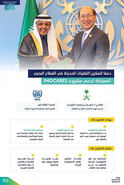 وقع معالي رئيس الهيئة العامة للنقل المكلف الدكتور رميح بن محمد الرميح مع الأمين العام للمنظمة البحرية الدولية السيد كيتاك لم، في لندن عقدًا لدعم مشروع IMOCares ، الهادف إلى دعم الجهود الدولية لتمكين التقنيات الحديثة في القطاع البحري، ودعم تطوير التكنولوجيا في العالم.