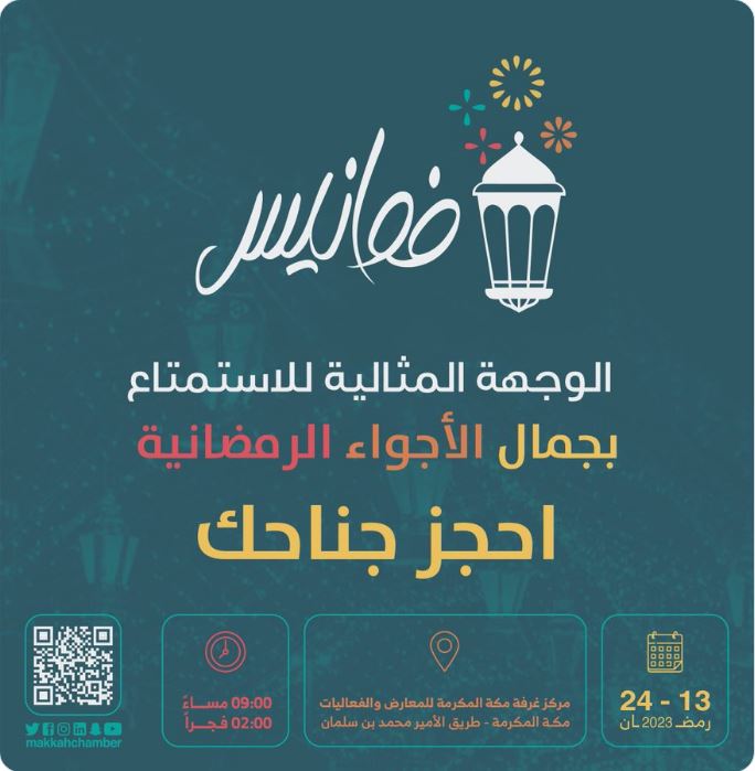 تطلق الغرفة التجارية بمكة المكرمة يوم 13 رمضان الموسم السادس من فعالية “فوانيس” ولمدة 12 يوماً، على أرض مركز غرفة مكة المكرمة للمعارض والفعاليات، بمشاركة العديد من الشركات الكبرى وأصحاب المشاريع الصغيرة بحزم من المنتجات والخدمات ذات العلاقة بطبيعة شهر رمضان المبارك، تدعمها أمسيات متنوعة وألعاب تفاعلية، ومواقع لعربات الطعام المتحركة “فود تركس”.